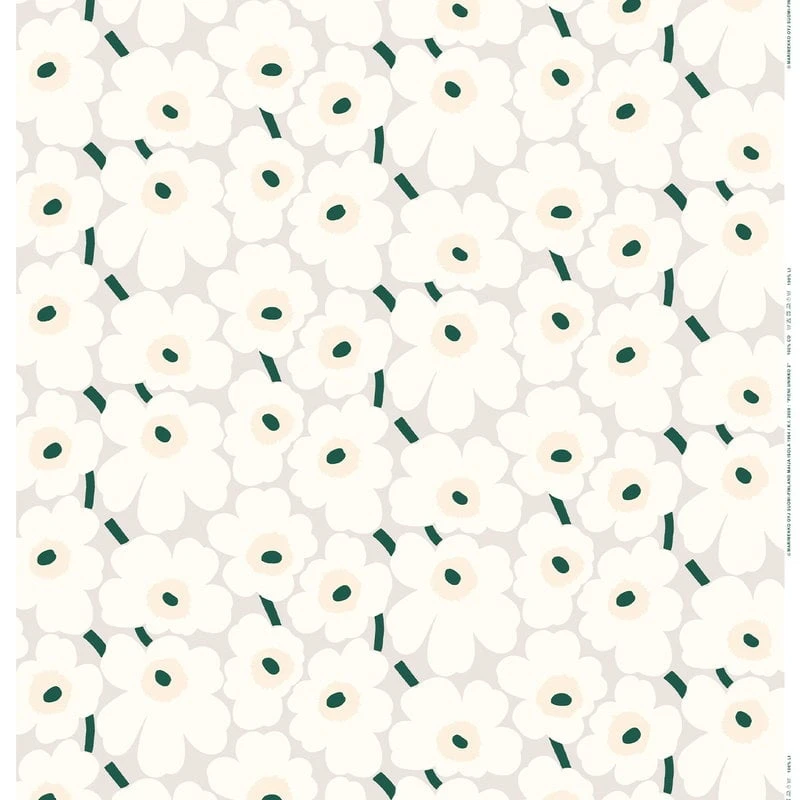 Marimekkoâs Pieni Unikko fabric features the iconic floral pattern by Maija Isola in a delicate colour combination of beige, off-white and dark green. The fabric is made of 100% cotton and has an acrylic coating, which makes it extremely easy to keep clean.Â