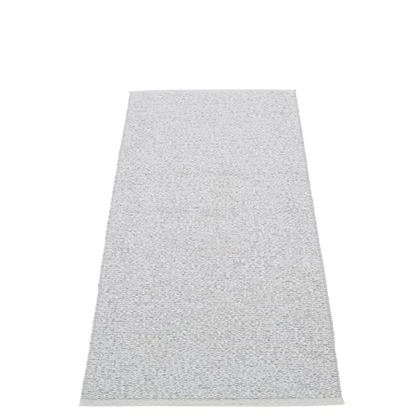 The Svea plastic rugs from Pappelina are woven on a traditional loom in Dalarna, Sweden. Made of phthalate-free PVC ribbon, the rugs are durable and easy to care for, and their two-coloured metallic shades are perfect for modern interiors. The Svea rug can easily be put to use as a hallway rug, kitchen area rug or outdoor rug. The Svea rugs come with an embossed logo on both ends.