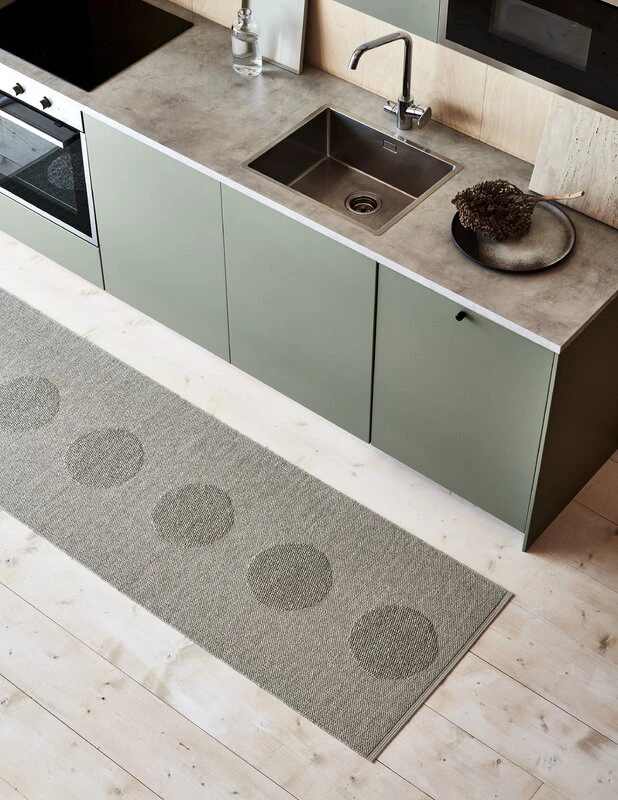 The main material of the Vera 2.0 rug is Biovyn, a bio-attributed PVC that is made from wood-based tall oil, a residue from the wood industry. The carbon footprint of Biovyn is more than 90% smaller compared to conventional PVC. The sustainably produced plastic rug is easy to clean and makes a practical choice for all spaces. Due to its narrow form, the rug can easily be put to use as a stunning hallway runner, a kitchen area rug or an outdoor rug. The Vera rug is woven using traditional techniques in Dalarna, Sweden.